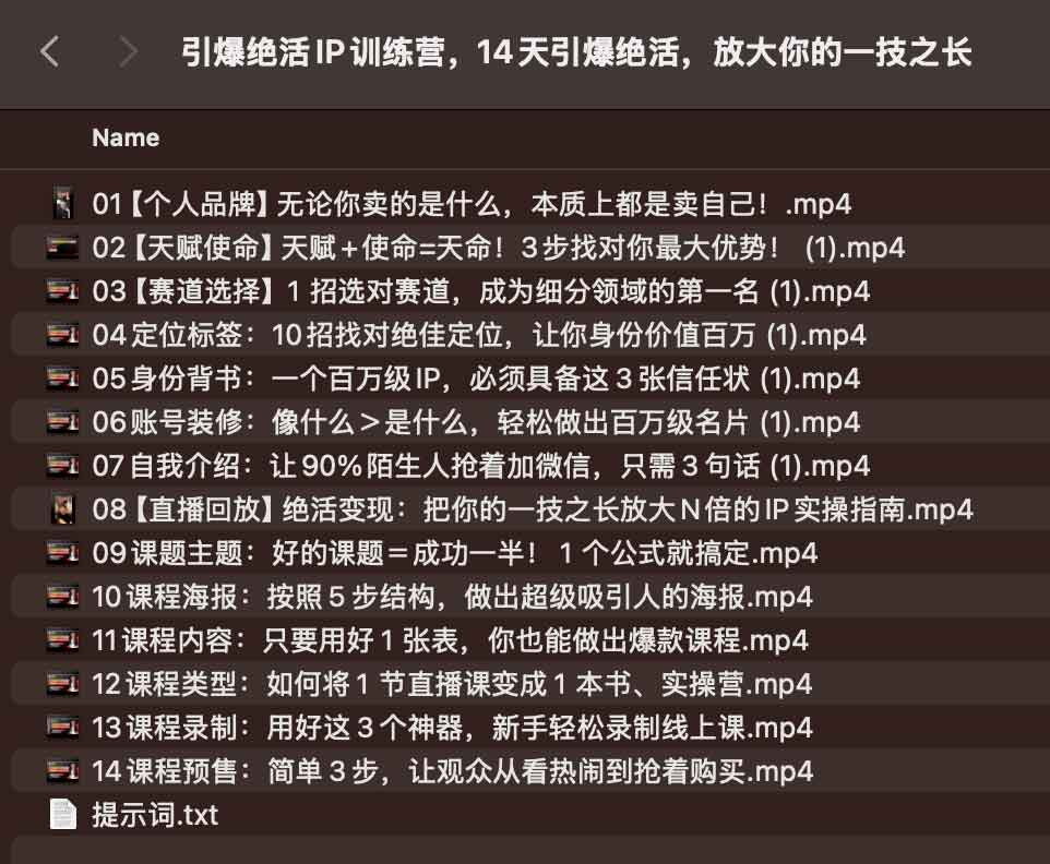 引爆绝活IP训练营,14天引爆绝活,放大你的一技之长,夸克网盘课程。这套成长体系专为知识型个体量身打造,聚焦个人技能商业化转型。课程从天赋挖掘切入,通过三步定位法锁定细分领域竞争优势,传授塑造百万级IP的定位策略与身份背书技巧。账号建设模块揭示“像什么大于是什么”的视觉传达法则,包含主页装修模板与三句话自我介绍公式,有效提升陌生人社交转化率。